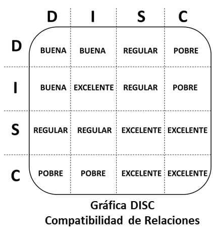 La gráfica de compatibilidad de tarea vrs relaciones se utiliza para proyectar la calidad y cantidad de interacción entre dos o más personas evaluadas con DISC. Prácticamente se explica por sí misma y se determina la compatibilidad al relacionar las letras del componente DISC que más influye en su temperamento. Es muy simple apreciar lo que puede pasar cuando dos personas se relacionan y la profundidad de análisis y diagnósticos que pueden llegar a resultar de esta simple gráfica.